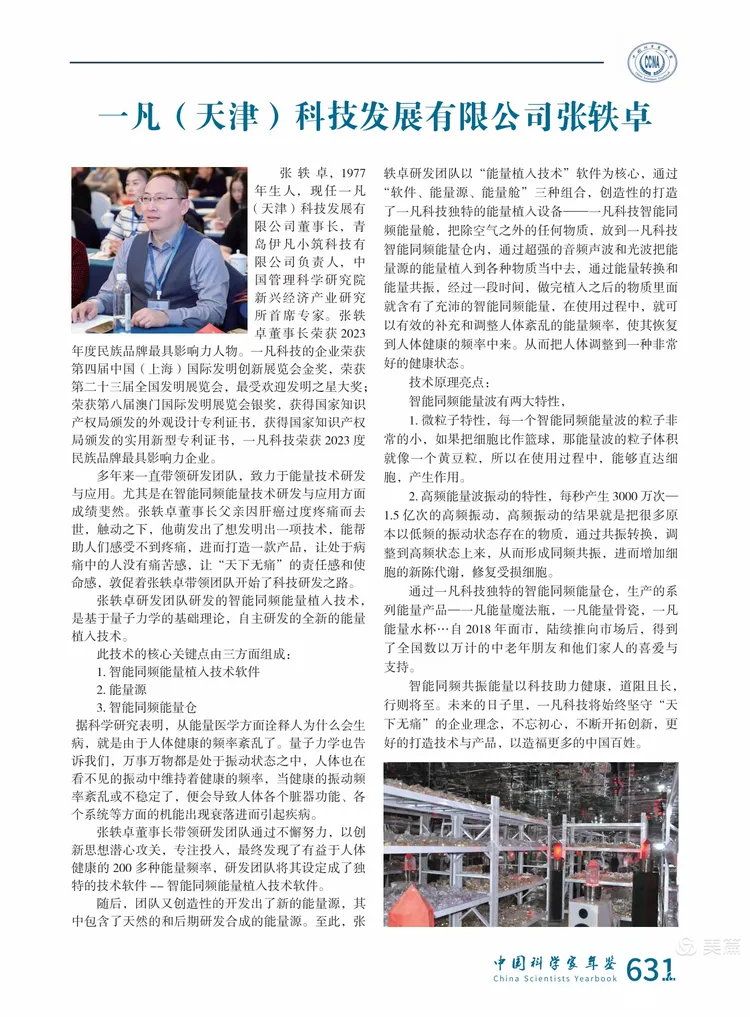 热烈祝贺一凡(天津)科技发展有限公司董事长,伊凡小筑品牌创始人张轶卓先生,入选由中国科学院主编的2023年度中国科学家年鉴!