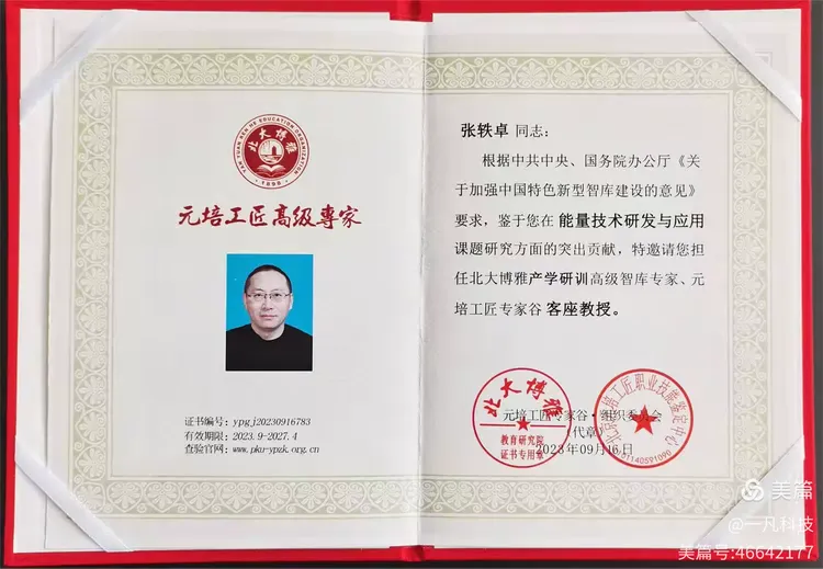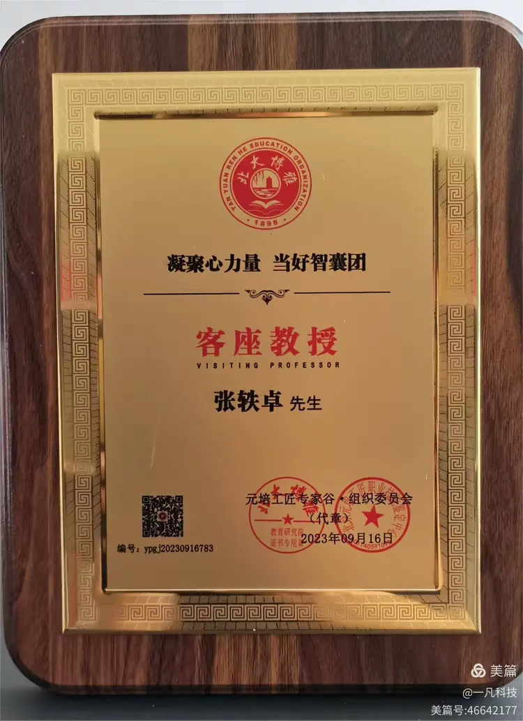 热烈祝贺一凡(天津)科技发展有限公司董事长、伊凡小筑品牌创始人,张轶卓先生,受邀担任北京大学北大博雅 产学研训 高级智库专家、元培工匠专家谷 客座教授。