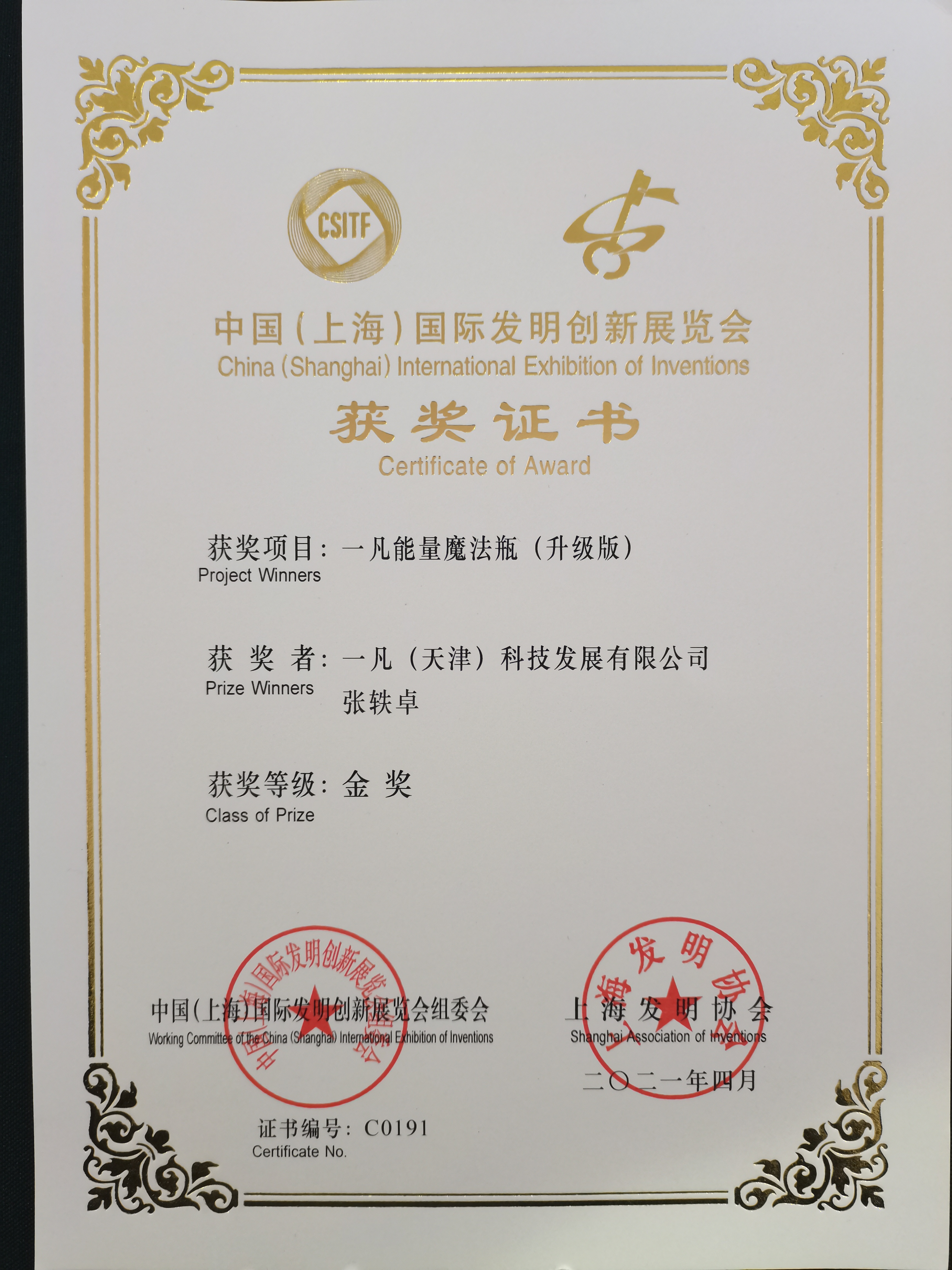 经过权威专家组的专业评审、专业观众的参评投票、现场观众的体验投票,一凡科技的一凡能量魔法瓶(升级版),在2000多项的最新发明中,凭借着独特的智能同频能量技术,和现场出色的体验感受脱颖而出,获得了本次创新发明大会的金奖。